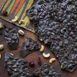 We love developing recipes that have 'sweet heat' - they start out sweet and finish with an unexpected, spicy kick. In this recipe, we combined rich, dark chocolate, warm and earthy Ceylon Cinnamon and smoky Ancho Chile Flakes for a chocolate bark that's got depth and a little bit of fire. Once you add tart cranberries, cashews and pistachios, this treat will be the hit of the party! This is a recipe that also makes a great holiday gift.