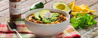 Speaking of flavor, let’s talk about our El Paso Chili Powder. We’ve got a whole bunch of chili powder blends to choose from to meet different needs regarding heat and flavor, but the El Paso is our go to if we want our chili to sizzle with a kick of heat. Hand blended with ancho, onion, extra-hot (90,000 SHU) cayenne, garlic, chipotle morita chile, allspice, and Mexican oregano. The flavors of the morita chile powder and ancho powder in the blend are enhanced in this recipe by their un-ground counterparts--we rehydrate and chop a chipotle morita, and use a fresh poblano, which is the parent pepper that's dried to make anchos. Let's hear it for double-duty peppers!